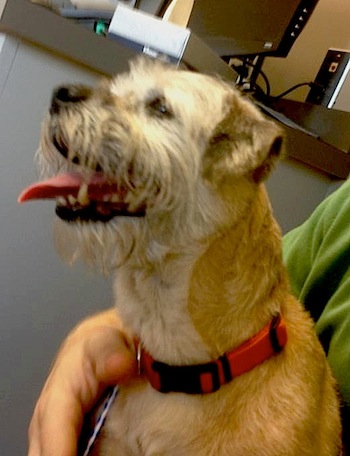 I thought about the first time we met Banjo. He was at the breeder’s house; a six-year-old handsome Border Terrier who was very happy to see us. As he clicked across the tile floor, he wagged his tail. At that moment we were family (he was a rescue; we were his third family). He joined our other Border Terrier, Molly (who happened to be his aunt). Four years ago, he was diagnosed with diabetes. Twice-a-day, everyday, we give him an insulin shot and feed him. For the most part, we’ve managed his diabetes well. We don’t test him, but know the signs when his glucose is crashing or spiking. He has fallen out (get the corn syrup!) and has had blood sugar that is too high (peeing and vomiting!). But for the most part, he has had a very happy life. Until Saturday. I was on the cusp of losing a good friend.